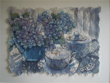 和紙にろうけつ染め手法と水彩画法を使って静物画を描きます。