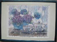 和紙にろうけつ染め手法であじさいを描きます。